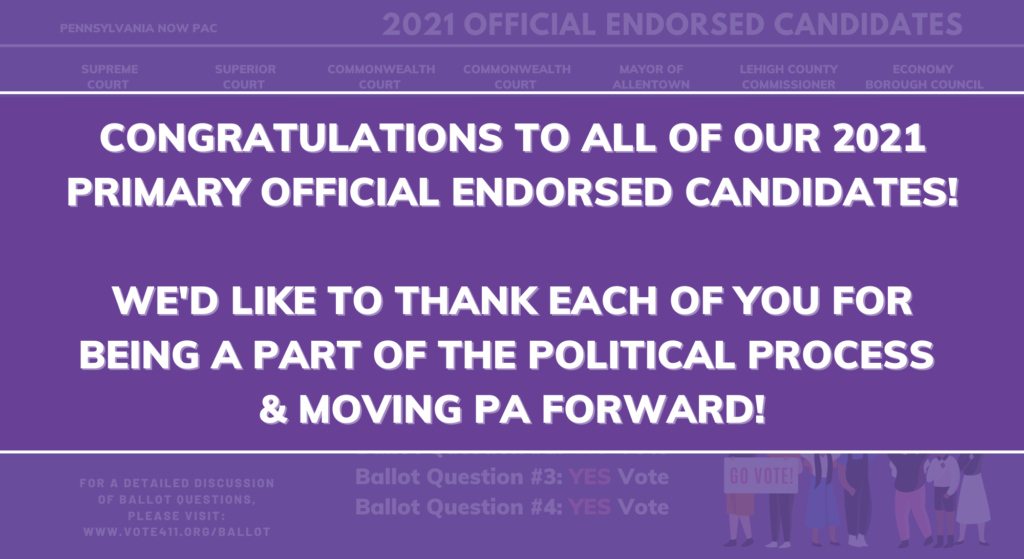 | The Pennsylvania NOW PAC was happy to support each of the candidates below on our 2021 Primary Feminist Ballot and we are proud of their commitments to advocating on behalf of our mission and supporting the communities we serve. Six of our seven endorsed candidates will go on to the general election in November 2021. We’d like to take a moment to congratulate all of our endorsed candidates and thank you for being a part of the political process and moving PA forward. |